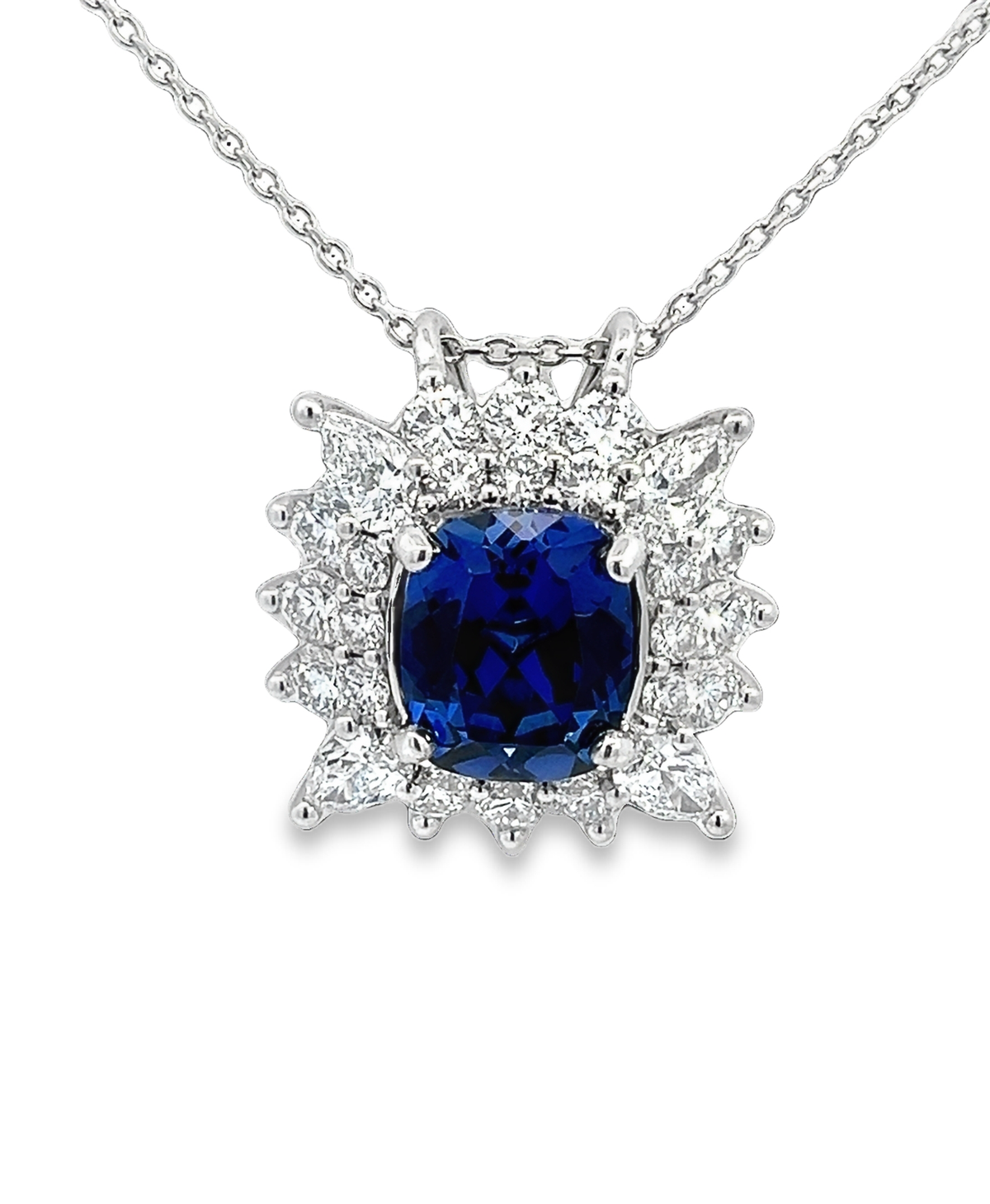 LAB GROWN CUSHION CUT BLUE SAPPHIRE3.85ctLAB GROWN PEAR (4) & ROUND (24) DIAMONDS 2.22ctw, 14KT WHITE GOLD CUSTOM PRONG SET HALO STYLE PENDANT 425146A
