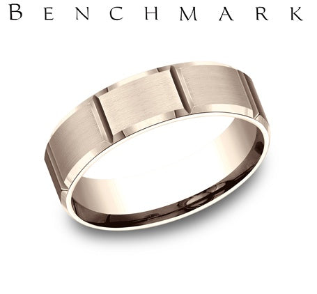 14KT ROSE GOLD 6MM BRUSHED WITH HIGH POLISH VERTICAL GROOVES AND BEVELED EDGE BAND CF66449 *PRICE WILL VARY BASED ON FINGER SIZE AND MARKET CONDITIONS-PLEASE INQUIRE FOR CURRENT PRICE*
