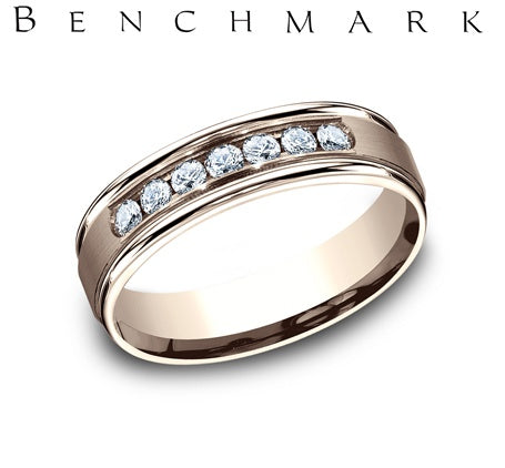 14KT ROSE GOLD CHANNEL SET SATIN CENTER HIGH POLISH EDGES MENS BAND ROUND DIAMONDS (7) 0.42CTW RECF516516 *PRICE WILL VARY BASED ON FINGER SIZE AND MARKET CONDITIONS-PLEASE INQUIRE FOR CURRENT PRICE*
